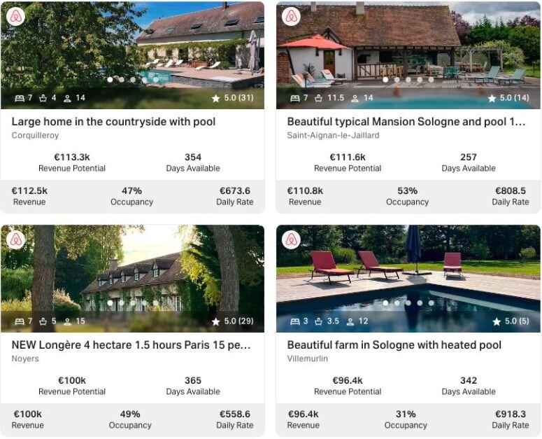 In addition, we analyzed similar offers in the region, particularly those managed by high-end concierge services. Here are a few examples of houses within a 30km radius offering similar amenities (more than 12 guests and a swimming pool):